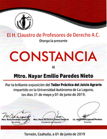 Ponente en el Taller Practico de juicio agrario organizado por El Claustro de Profesores de Derecho A.C., en la Universidad Autónoma de la Laguna.